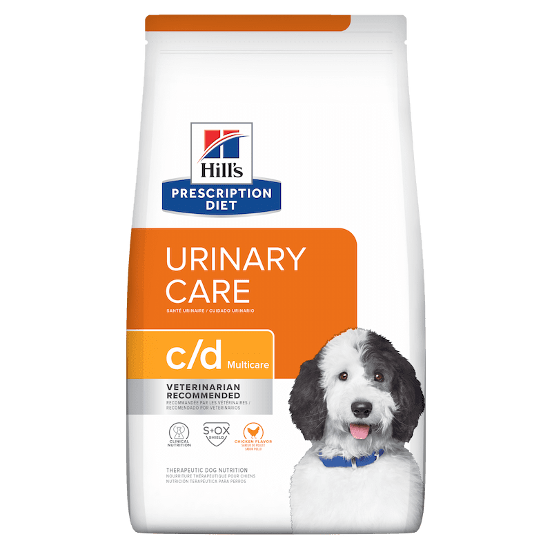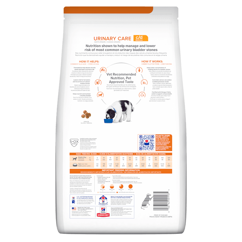 Hill’s Prescription Diet c/d Multicare is clinical nutrition specially formulated to reduce the risk of calcium oxalate and struvite stones in dogs. It?s made in the USA with global ingredients you can trust, and was developed by Hill?s nutritionists and veterinarians. This food is enriched with antioxidants, potassium citrate and omega-3 fatty acids, and also includes controlled fat levels and low sodium. Please consult your veterinarian for further information on how Prescription Diet foods can help your dog continue to enjoy a happy and active life.
