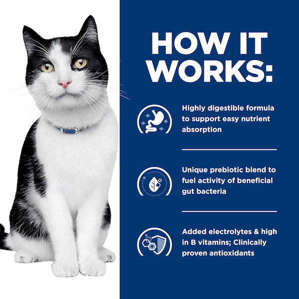 The recipe also includes omega‑3 and -6 fatty acids for overall well-being and a proprietary prebiotic fibre blend (ActivBiome+) clinically shown to nourish the gut microbiome, promoting healthy digestion and optimal stool quality. Developed by Hill’s nutritionists and veterinarians, this diet is suitable for cats requiring gastrointestinal support.