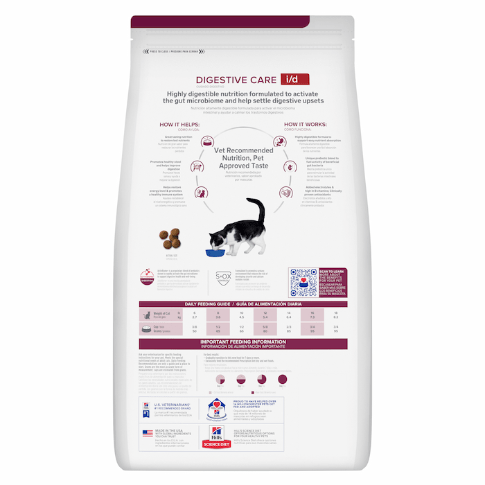 Hill’s Prescription Diet® i/d Digestive Care Dry Cat Food is a complete and balanced diet formulated to help adult cats and kittens with digestive upsets. The highly digestible formula supports easy nutrient absorption and provides electrolytes, B vitamins, and clinically proven antioxidants to support overall health and a strong immune system.