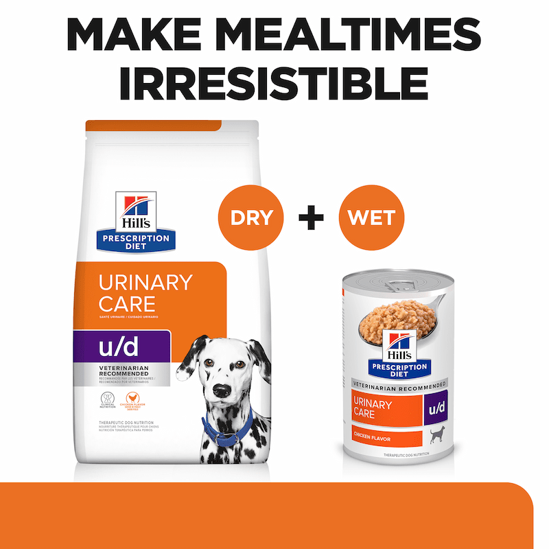 Hill’s Prescription Diet® u/d Urinary Care Dry Dog Food is a complete therapeutic diet developed by veterinarians and nutritionists to help adult dogs with urinary bladder health concerns, particularly dogs prone to urate or cystine urolithiasis (bladder stones).