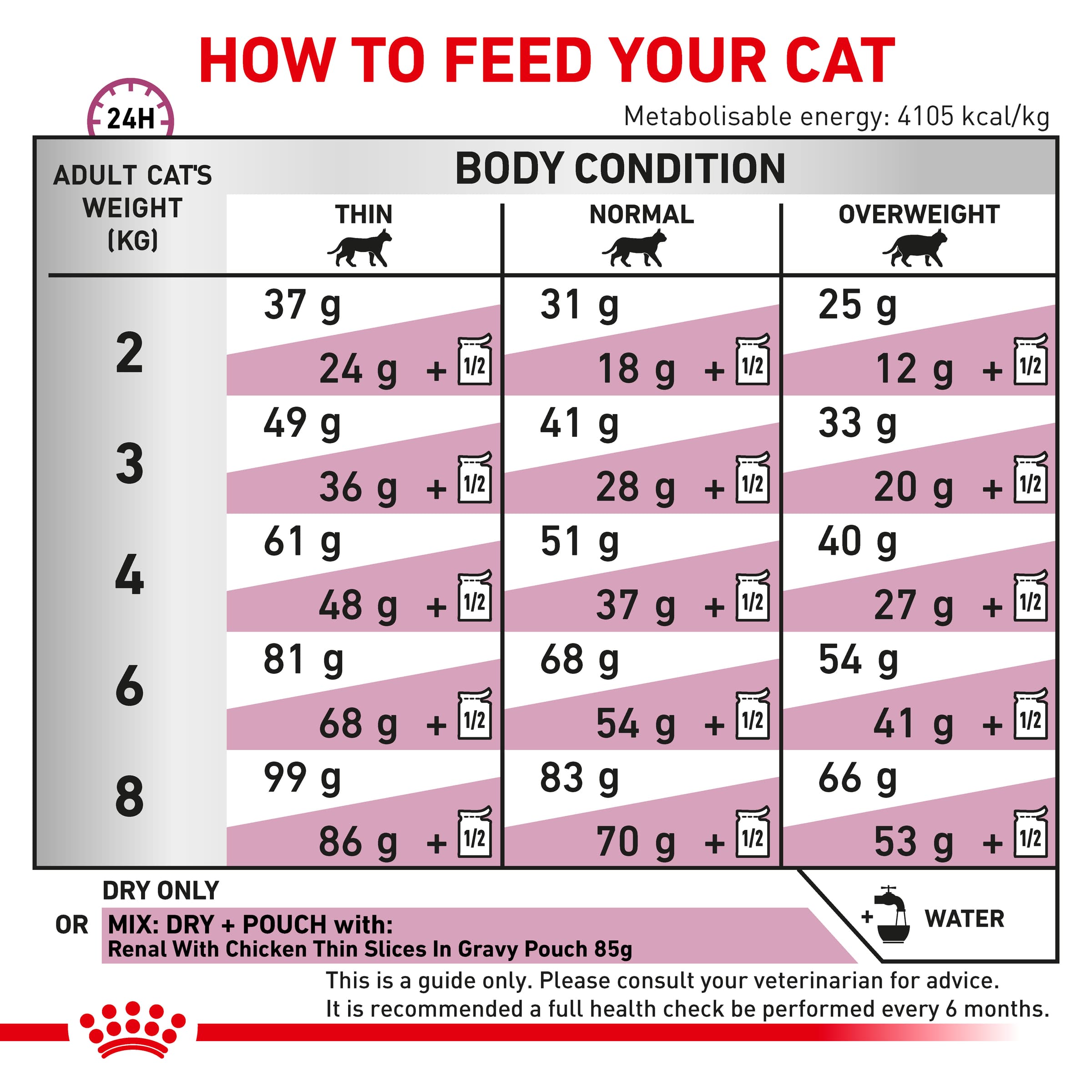 Early Renal diet is recommended when the cat is diagnosed in CKD stage 1 or clinoptilolite of sedimentary origin: 0.2 g. early stage 2 and non-proteinuric. Cats may remain on Early Renal until creatinine elevates outside of reference ranges. At this point, the cat should be switched to a Renal diet. It is recommended that a full health check be performed every 6 months.